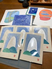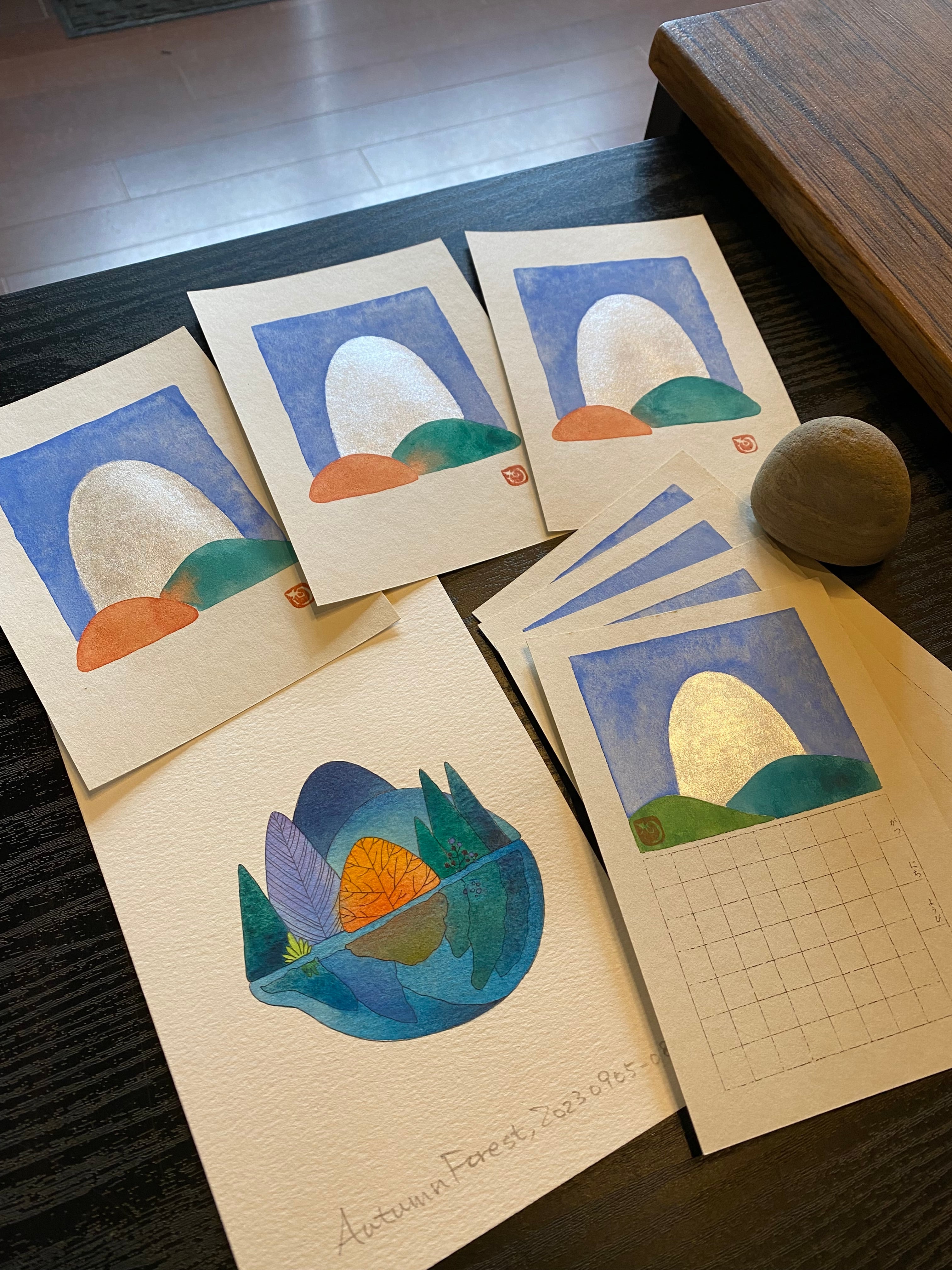 100×150mm(パルパー紙) 世界遺産・石見銀山にちなんだ、手描きの絵はがきです。山の部分を銀の絵の具(顔彩)で着色していますので、角度によって銀山のきらめきをお楽しみいただけます。